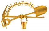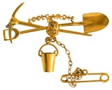 COOLGARDIE (GOLDFIELDS) BROOCH, c1899, in gold (15ct; 8.28g; 60x40mm), made by Larard Bros, features a crossed pick axe and shovel with a gold nugget in ...