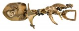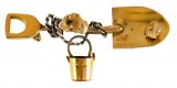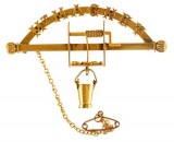 PROSPECTOR'S SHOVEL BROOCH, in gold (18ct; 2.44g; 34.5x10mm), no maker, features prospector's shovel with a bucket suspended below on a coiled chain and in the ...