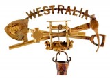 WESTRALIA GOLD NUGGET BROOCH, c1910, in gold (15ct; 4.97g; 42x28mm), by LB (Louis Boxhorn), features an array of miner's tools and a gold nugget with ...