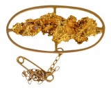 GOLD NUGGET BROOCH, in gold clip holder (15ct; tot wt 15.89g; 33.5x21.5mm), by T.F.Machin, features a genuine gold nugget in a clip holder, pin-back, with ...