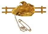 GOLD NUGGET BROOCH, in gold (18ct; 5.24g; 48x12mm), maker unknown; features a double bar and in the centre is an alluvial gold nugget, pin-back, with ...