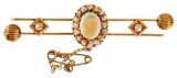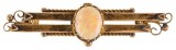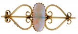 OPAL BROOCH, c1910, in gold (15ct; 6.55g; 55x19mm), maker unknown, features a decorative thin single bar and in the centre is a claw set oval ...