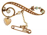 OPAL AND PEARL BROOCH, in gold (15ct; tot wt 8.08g; 46x25mm), by Denis (Bros), features natural seed pearls inset in a decorative scrolling setting and ...