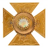 OPAL BROOCH, in gold (15ct; 7.21g; 27x27mm), by R H Mc(Donald), features a gold cross with engraved decoration and in the centre is a small ...