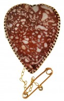 STONE BROOCH, in gold frame (9ct; tot wt 9.66g; 28x36mm), by Shaw & Co, features a heart shaped polished stone claw set in a gold ...