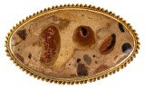 RHYOLITE BROOCH, in gold frame (15ct; tot wt 11.05g; 42x25.5mm), by Levinson, features an oval rhyolite rock set in decorative edged gold frame, pin-back with ...