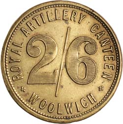 ROYAL ARTILLERY CANTEEN, Woolwich, tokens, penny in brass (26mm), obverse 'Royal Artillery Canteen Woolwich', reverse, ...