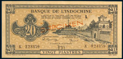 FRENCH INDO CHINA, Banque de L'Indochine, one hundrred pastres nd. c.1945, specimen issue number 00090931, ...