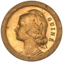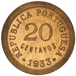 PORTUGUESE GUINEA, five centavos 1933 (KM.1), twenty centavos 1933 (KM.3), fifty centavos 1946 (KM.6), one escudos 1946 (KM.7). Four small spots on reverse of first coin, one spot on reverse of third coin but all coins uncirculated with full mint lustre and scarce. (4)