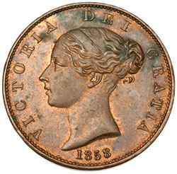 QUEEN VICTORIA, young head, copper penny, 1858 O.T. (S.3948). Extremely fine.