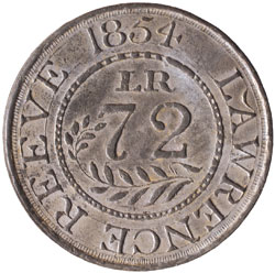HOP PICKERS TOKENS, (Henry) N(oakes), Elms Farm, Pett. zinc punched, values 1, 2, and 4 (H.370); (H) J(ames) P(ingen), Frankwell Farm, Ashburnham, lead cast, value 2.6 (H.404) (illustrated); R(ichard) P(errey), Higham Farm Northiam, brass punched B, zinc punched IB (H398 (i) (iii)); K(ingsnorth) Reeve, Morley Farm, Peasmarsh, cast brass, values B/1, D/3 (H.428); L(aurence) R(eeve), Marley Farm, Peasmarsh, alloy cast, values 1, 12, full name 12, 72 dated 1854 (illustrated) (H.430 (iii)); Lawrence and John Reeve, Beckley, cast lead alloy values 1 and 12 (H.432). Fine-good very fine. (15)