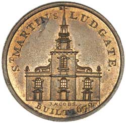 SKIDMORE'S CHURCHES AND GATES, St Giles in the Fields (D&H 587a), St Bennet Gracechurch 1797 (D&H 589), St Andrews Holborn (D&H 595), All Hallows Lombard Street 1797 (illustrated) (D&H 599), St Martins Ludgate (D&H 612) (illustrated), St Lukes, Old Street (D&H 615). Extremely fine - red uncirculated. (6)