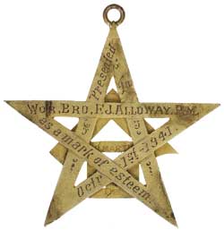 MELBOURNE 8 HOURS ANNIVERSARY COMMITTEE, 1898, in silver with rope surround (34mm) reverse engraved 'J.Alloway' beneath clasped hands, all within wreath; Freeemasons Homes of Victoria, Life Governor's badge, in gilt and enamel (27mm) by Stokes, Melb, engraved on reverse 'Mrs F.J.Alloway/1955'; handcrafted fob in the shape of a five pointed star with overlay of Masonic symbols, in gold (9ct, 49mm, 6.6g) engraved on reverse 'Presented to/Wor.Bro. F.J.Alloway P.M./as a mark of esteem/Oct 1st 1941'. Very fine - good very fine. (3)