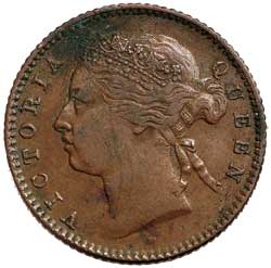 STRAITS SETTLEMENTS, Queen Victoria, quarter cent, 1883 (KM.7). Uneven patina, corroded near edge, otherwise very ...
