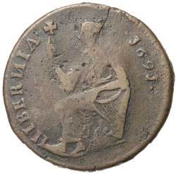 IRELAND, James II, halfpenny, 1686 (S.6576); Limerick beseiged, halfpenny and farthing, 1691 (S.6594, 5). Very ...