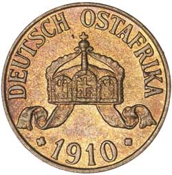 GERMAN EAST AFRICA, Wilhelm II, half heller, 1904A, one heller, 1907J, 1910J, five heller, 1913A, ten heller, 1910J, 1914J (KM. ). Second and last very fine, others nearly uncirculated - uncirculated. (6)