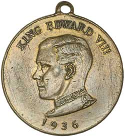 GREAT BRITAIN, Edward VIII, trial model for award medal, undated (1936), in dark bronze (32mm) (G.CM172.2a), obverse, uniformed bust facing within a circle with three stars below, reverse, laurel wreath; Daily Dispatch Birthday Club medal, 1936, in bronze (32mm) (G.CM176a), with suspension loop, obverse, Edward VIII bareheaded and uniformed bust left, reverse, 9-line inscription within quatrefoil with rose and thistle at indentations; badge, undated (1936), in pressed brass plate (31x53mm) (G.CM181.6), pin back, shield with central disc containing head of Edward VIII right and with a crown at top of shield, on card of issue; Proposed Coronation, 1937, in gilt (38mm) (G.CM196c; BHM4304), no suspension, obverse, crowned and robed bust of Edward VIII right, reverse, 5-line inscription within wreath of rose, thistle, shamrock and laurel with overlay of Royal Arms and Arms of the Dominions, at left and right edge, 'Made In/England'; another, 1937, in dark bronze (37.5mm) (G.CM225.1b), with suspension loop, obverse, crowned and robed bust of Edward VIII right, reverse, crown and sceptre on cushion with rose branch at side, Westminster Abbey in top right field. Very fine - extremely fine. (5)