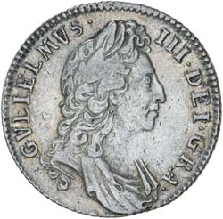 WILLIAM III, sixpence, first bust, early harp, 1696 (S.3520). Attractive glossy iridescent tone, good extremely ...