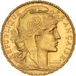 FRANCE, Third Republic, ten francs, 1894A (KM.830); twenty francs, 1908 (KM.857). Good very fine; uncirculated. (2)