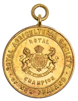 M.& W.C. A.& P.A. (Manawatu & West Coast Agricultural & Pastoral Association), medal struck uniface in gold (15ct, 11.09g, 26mm), by Bock (W.R.Bock, Wellington), reverse inscribed '1927/CH./Friesian Cow/O.W.Cadwallader'; another in gold (15ct, 9.7g, 26mm), by M&K (Mayer & Kean, Wellington), reverse inscribed 'Ch.Friesian Cow/1930/C.A.Cadwallader'; another in gold (15ct, 9.81g, 26mm), by M&K, reverse inscribed 'Ch.Friesian Bull/1930/O.A.Cadwallader'; another in gold (15ct, 9.48g, 26mm), by M&K, reverse inscribed 'S/Show/1931/Ch.Friesian Bull/O.A.Cadwallader'; another in gold (9ct, 8.46g, 26mm), by M&K, reverse inscribed 'S/S/ 1934./Ch.Friesian cow/C.A.Cadwallader'; another in gold (9ct, 8.73g, 26mm), by M&K, reverse inscribed 'S/S 1935/Ch.Friesian Cow/O.A.Cadwallader'; Royal Agricultural Society of New Zealand, Royal Champion medal die struck in gold (9ct, 15.06, 30mm), by M&K, reverse inscribed 'Friesian Bull/O.A.Cadwallader/1930'; another identical in gold (9ct, 15.35g, 30mm), by M&K, reverse inscribed 'Friesian Cow/A.O.Cadwallader/1936/Christchurch'; another identical in gold (9ct, 14.32g, 30mm), by M&K, reverse inscribed 'Friesian Cow/1937/O.A.Cadwallader's/"Woodlea Diamond".' M.A.& P.As. (Masterton Agricultural & Pastoral Association), 1932, die struck in gold (9ct, 7.59g, 26mm) (2), no maker, reverse on first inscribed 'CH./Friesian Cow/O.A.Cadwallader', and on the other 'CH./Friesian Bull/O.A.Cadwallader'; N.Z Friesian Assocn, uniface, die struck in gold (9ct, 8.91g, 26mm), no maker, reverse inscribed 'Dannevirke A&P Show/1932/Most Points/O.A.Cadwallader'; Wairarapa & East Coast P & A Society, die struck in gold (9ct, 7.64g, 26mm), no maker, reverse inscribed 'Champion/Friesian Cow/1936/O.A.Cadwallader/"Woodlea Diamond".'; another identical in gold (9ct, 7.16g, 26mm), no maker, reverse inscribed 'Champion/Friesian Cow/O.A.Cadwallader/"Woodlea Diamond"/1937', all the above listed medals have ring top suspension (tot gold wt 9ct 100.81g, 15ct 40.08g). Good very fine - extremely fine. (14)