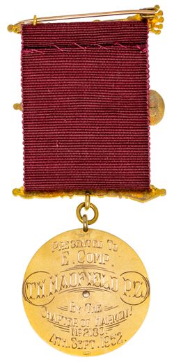 MASONIC, Manukau Lodge No.2245, jewel, handcrafted in silver gilt (drop 45x40mm), by Hearn (J.T.Hearn, Adelaide), reverse inscribed 'Presented to/Primo T.H.Hadfield/for/Services Rendered/1924'; Chaper of Harmony, No.2180, jewel, handcrafted in gold (9ct, tot wt 29.3g, drop 42x38mm), no maker, reverse inscribed 'Presented To/E.Comp/T.H.Hadfield P.Z./By The/Chapter of Harmony/No.2180/4th Sept.1952'. Extremely fine.