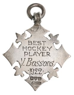 N.P.T.C. (New Plymouth Technical College), stock fob medal, in gold (9ct, 3.3g, 32x23mm), unidentified maker, ring top suspension, reverse inscribed 'V.Bosson/Best/Player/Hockey Team/1921'; another, fob medal, in silver with gold (35x30mm), English maker and hallmark, reverse inscribed 'Best/Hockey/Player/V.Bossons/1922'. Very fine. (2)