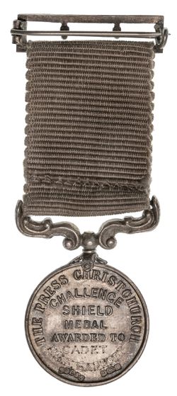 N.Z.E. (New Zealand Engineers) Reserve Depot, Christchurch, England, prize medal in bronze (38mm), scroll suspension, reverse inscribed 'Bowling/1918/55049/Spr Garrett J.H.'; The Press Christchurch Challenge Shield Medal, in silver (26mm), by JRG&S (J.R.Gaunt & Son), hallmark for Birmingham 1942, swivelling scroll style ribbon suspender with brooch bar, obverse legend 'For Hearth & Home Public School Cadets New Zealand', reverse inscribed 'Cadet/R.S.F.Garrett'. The first with some oxidation on reverse, otherwise fine; the second toned extremely fine. (2)