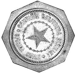 CHILE, Antofagasta Province, Compania, Salitrera Alemana (German Saltpeter Co.) Officina Chile, 5 in brass (59mm) milled edge (cf Rulau Ant 94); also value one load of product in brass, octagonal (41mm) star in centre both sides instead of numeral. Good extremely fine (2).