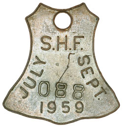 SYDNEY HARBOUR FERRIES LTD, passes, all in silver-plated brass except the last two which are gilt brass, all with blank reverses, all with impressed serial number and all with pierced hole at top for loop suspension; type 1, roughly oval shaped with knob at top, 'S.H.F' at top and number 019 below, at sides and bottom 'APRIL 1959 JUNE'; type 2 identical to previous but number 008 and with voided letter S at bottom; type 3, roughly bell shaped, around the sides 'S.H.F. / JULY / SEPT / 1959' and number 088 above year; type 4, roughly inverted fan shaped, 'S.H.F.' at top and 'OCT. 1959 DEC.' around bottom with number 183 at lower centre; type 5, identical to previous but number 118 and with voided letter S horizontally above centre; type 6, narrow oval, 'S.H.F. / OCT. / DEC. / 1959' with number 17 at bottom; type 7, identical to previous but number 27 and with a voided letter S at centre right, (Seckold 720KU, 720KV, 720KW, 720KY, 720KZ, 720LA, 720LB). Very fine - good very fine and scarce, the last two items rare. (7)