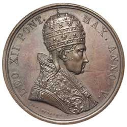 VATICAN, Papal medals in patinated bronze, Alexander VII, Queen Christina Entry to Rome, 1656 (36.1 mm) (Mazio 251); (33.3mm) (Mazio 252); Plague, 1657 (34.4mm) (Mazio 254, var.78); Clement XI, Coronation, 1701 (51mm) (Mazio 380, var.151); Basilica Reconstruction, 1702 (43.1mm) (Mazio 382, var.157); Eucharist Procession, 1665 (41mm) Maundy, 1668 (41mm); Leo XII, Genoa Mountain Chapel, 1828 (42.8mm) (Mazio 593). Good extremely fine or better, each with descriptive ticket. (8)