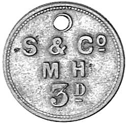 UMZIMKULU, Strachan and Co, complete series of sets I (uniface), II (MH) and III (both sides)(2) of store checks in brass. 2/-, 1/-, 6d and 3d, set II has MH as well as S& Co., M.H. stands for Mountain Home the location of Rupert Jackson's store, he was a cousin of the Strachans, undated but circa 1895 up till 1930's (T.E.G & T IX; M.582- 595). Very fine - nearly uncirculated, only a few sets known of set II, the MH set (16).