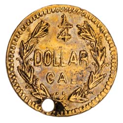 UNUSUAL WORLD COINS, India, Maratha gold fanam (0.33g) (F.1322), Travencore, gold fanam, c1800 (0.18g) (F.1400), Myna gold fanam (AH 1189) (KM.9, F.1348a) (c1776) (0.18g); USA, Private Territorial gold quarter dollar 1871 CAL (California) (holed); unusual silver coin Laos (1591-1707), tiger tongue (95.70g) (cf Mitchener 3004). Fine - extremely fine. (5)