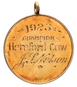 W. & E.C. P. & A.S. (Wairarapa & East Coast Pastoral & Agricultural Society), fob medal, struck uniface in gold (9ct, 8.9g, 26mm), by G.T.W. (G.T.White, Wellington), reverse inscribed 'Champion/Hereford Cow/J.S.Nelson's/Rosedale Maritana/1922'; another, as last, in gold (9ct, 8.6g, 26mm), reverse inscribed '1923/Champion/Hereford Cow/J.S.Nelson/Rosedale Maritana'; another, as last, in gold (9ct, 7.6g, 26mm), by P.N.D. (P.N.Denton, Wellington), reverse inscribed 'Champion/Hereford Cow/J.S.Nelson/1925'; M. & W.C. A. & P.A. (Manawatu & West Coast Agricultural & Pastoral Association), struck uniface in gold (15ct, 10.3g, 26mm), no maker, reverse inscribed '1923/Champion/Hereford Cow/J.S.Nelson'. All with ring top suspensions, extremely fine. (4)
