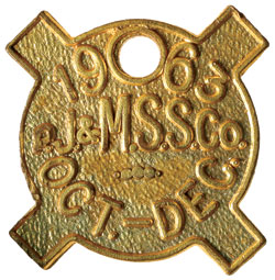 PORT JACKSON & Manly Steamship Co Ltd, passes, all with hole pierced for suspension loop except second, fifth and seventh which have suspension loop, all with impressed serial number on reverse and all except sixth with maker's name 'AMOR / SYDNEY' on reverse and all in gilt brass; type 1, shield shaped, 'JULY / DECEMBER / 1963 / P.J.& M.S.S.Co' top to bottom, number 392; type 2 rectangular shaped with ornate top and knob at bottom, '1963 / JULY / SEPTEMBER / ....... / PJ&MSSCo', number 89; type 3, in shape of circle on a St Andrew's cross, ' 1963 / P.J.&M.S.S.Co. / OCT. - DEC.' top to bottom, number 6; type 4 oval shaped with indented sides, '1964 / JAN / - / JUNE / P.J.&M.S.S.Co.' top to bottom, number 446; type 5, two circles joined by thick arc, 'P.J.&M.S.S.Co. / 1964 / JAN. MARCH' top to bottom, number 79; type 6, circular shaped, 'APRIL JUNE'at top, '19 / 64' either side of centre hole, 'P.J.&.M.S.S.Co.' at bottom, number 101; type 7, upset triangle with points cut-off, 'JULY - / P.J.&M.S.S.Co. / Dec / 1964' top to bottom, number 395; type 8, three leaf clover shaped, 'JULY / P.J.&M.S.S.Co. / SEPT. / 1964' top to bottom, number 114, (Seckold 480OF, 480OG, 480OI, 480OK, 480OL, 480ON, 480OP, 480OQ). Very fine - good extremely fine, the first, fourth and seventh items are scarce, the rest are very scarce. (8)