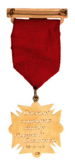 WHANGAREI FIRE BRIGADE, a unique grouping to Fred Gardner, spanning at least 45 years service from 1931-1976: United Fire Brigades Association of N Z, Long Service Medal for five years service, in silver (39mm) by A.T. (Anton Teutenberg, Auckland), with (5) 2 Years Service bars, reverse inscribed 'Fireman/F.S.Gardiner/by/Whangarie V.F.B/1.4.36' (D&C.L3; O&D.115) [illustrated]; U.F.B.A. (United Fire Brigades Association), 25 Years Service Star, in gold (9ct, tot wt 44.4g, 40mm), no maker, with gold 2 Years Service bars (10) (O&D.115), reverse inscribed 'F.S.Gardner/Whangarei F.B./1-4-56.' [illustrated]; Honorary Life Member (Provincial) medal in silver, by D.B., reverse inscribed 'A.P.B.F.A./F.S.Gardner/1960' (O&D.115) [illustrated]; Honorary Life Member medal in silver, by D.B., reverse inscribed 'F.S.Gardner/Whangarei F/B /7-4-76'; fob medal, hand engraved in gold (9ct, 4.0g, 35x26mm), English maker and hallmark, scroll and ring top suspension, reverse inscribed 'Two Men Disabled/1937/F.Gardiner'; another, hand engraved in gold (9ct, 4.0g, 30mm), no maker, ring top suspension, reverse inscribed '2nd/Gilbert Memorial/T.Gardiner (sic)/1937'; another, hand engraved in gold (9ct, 5.0g, 24mm), English maker and hallmark, scroll and ring top suspension, reverse inscribed 'W.V.F.B./Two Men Event/F.Gardner/1939'; another, 'Jubilee', hand engraved in gold (9ct, tot wt 8.9g, 30x28mm), no maker, ring top, ribbon and bar with pin-back, reverse inscribed 'One Man/Coupling/won by/Fireman F/Gardiner (sic)/23-11-46' [illustrated]; Whangarei Fire Brigade, medal in silver, reverse inscribed 'The/A.H.Kearne/Shield/Won By/F/M F.Gardner/1951' [illustrated]; another as last, with same inscription but dated '1953'; another, as last (1953) but named 'S/O F.S.Gardner'; Whangarei Borough, Fire-Brigade Jubilee, 1902-1952, struck uniface in silver (45x40mm), no maker, ring top, ribbon and bar with pin-back, reverse inscribed 'Fireman/F.S.Gardner.' (M&P.-) [illustrated]; another, hand engraved in silver (42x30mm), no maker, ring top ribbon and bar with pin-back, reverse impressed 'Whangarei/V.F.B./Jubilee/1952/"A" Shield.' and inscribed 'F/M F.Gardner.' [illustrated]; another, hand engraved in voided gold (9ct, 9.0g, 35x30mm), no maker, ring top, ribbon and bar with pin-back, reverse inscribed 'W.V.F.B/Efficiency Medal/1953/Won/By/S/O F.S.Gardner' [illustrated]. Very fine - extremely fine. (14)
