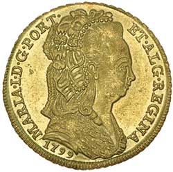 BRAZIL, Maria, six thousand four hundred reis or half Johanna, 1799 R (Rio) (KM.226.2). As struck, nearly uncirculated.