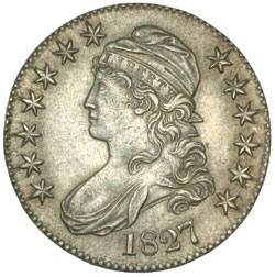 U.S.A., silver half dollar, capped bust type, 1827 square based 2. Nearly uncirculated.