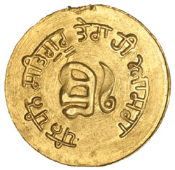 SIKHS, gold medallion, 8.58 grams, obv. Guru Nanak with Mardana and Bala in shade of a tree, various symbols in exergue, rev. Gurmukhi 1 and initial letter 'om' with circular Gurmukhi legend around, plain order, undated. Nearly extremely fine and rare.