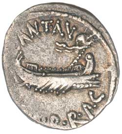 MARK ANTONY, (32-31 B.C.), silver denarius, mint moving with Mark Antony, (3.754 grams), obv. praetorian galley to right with rowers etc., around legends ANT AVG [III VI]R. R.P.C., rev. legionary eagle between two standards, LEG XIX below, (S.1479 [£100], Cr.544/35, Syd.1242, C. Mark Antony 55). Toned, off centred reverse, otherwise very fine.