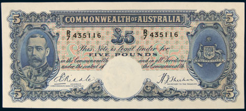 FIVE POUNDS, Riddle/Sheehan (1933) R$/7 435116 (R.44a) pink face. Flattened but almost crisp extremely fine ...