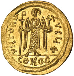 PHOCAS, (A.D. 602-610), gold solidus, Constantinople mint, (4.430 grams), issued A.D. 607-610, Officina E, obv. Phocas facing bust, bearded, wearing cuirass, paludamentum and crown, holding cross, around dNN (sic) FOCAS PERP AV, rev. Angel facing, holding in right hand long staff, with partial chi-rho symbol at top, in left hand globe with cross above, around VICTORIA AVGU E, (S.620, DOC 10e.6-7, cf.BMC 6-7, cf.T.9, R.-). Extremely fine, proof-like field, nearly as struck with some mint bloom.