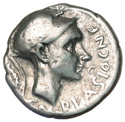 CN. BLASIO CN.F. (112-111 B.C.), silver denarius, Rome mint, (3.874 grams), obv. Scipio Africanus the Elder or Blasio, helmeted head to right, * above, CN.BLASIO.CN.F below and before, symbol behind, rev. Jupiter standing between Juno and Minerva, ROMA in exergue, [AB] monogram in right field, (S.173 [£80 VF], Cr.296/1c, Syd.561c). Weak in places otherwise, very fine and scarce.