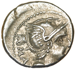 L. FLAMINIUS CHILO, (109-108 B.C.), Rome mint, (3.276 grams), obv. helmeted head of Roma to ...
