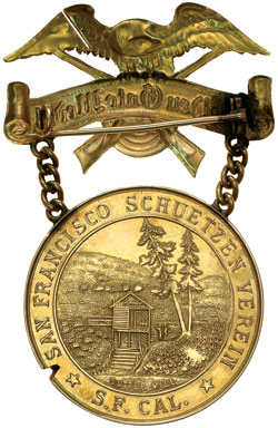 U.S.A., California Midwinter Exposition, 1894, shooting festival "Golden Gate" medal in gold (23.4gms, 38mm diameter, 67mm from top of eagle), obverse: modified design of California state seal, "Midwinter Fair Sooting Festival *1894*" around, reverse scene of "Sutter Mill", "San Francisco Schuetzen Verein *S.F. Cal.*" around, top suspension brooch with eagle standing on scroll with "Golden Gate Medal" across, two crossed rifles behind, pin back, seperated from medal by two pieces of oval link chain. 1mm "V" shape test cut piece missing from edge at 4 o'clock, break in right eagles wing, otherwise extremely fine and rare.