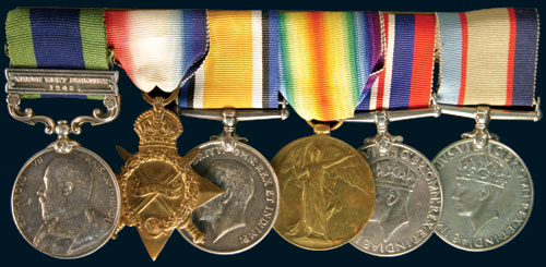 GROUP OF SIX: India General Service Medal 1908-35, one bar - North West Frontier 1908; 1914-15 Star; British War Medal 1914-18; Victory Medal 1914-19; War Medal 1939-45; Australia Service Medal 1939-45. 1321 Sub. Con. E.L.Wynn S. & T. Corps on first medal, Cpl E.Wynn S.A. Vetry C. on second medal, 5237 ER-Sgt. E.Wynn 4 Bn. A.I.F. on third and fourth medals and T255384 E.L.Wynn on fifth and sixth medals. First medal engraved and renamed, the rest are impressed. Swing mounted. Very fine.