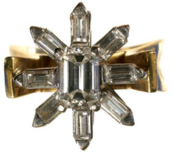 LADIES RING, 18 carat gold with white gold claws, set with central emerald cut diamond (.8 carat) and eight baguette diamonds (gross weight one carat).