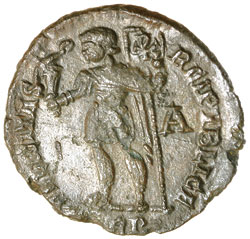 MAGNENTIUS, (A.D.350-353), AE centenionalis, Treveri mint, (4.432 grams), obv. I M CAE MAGN ENTIVS AVG, bare headed bust, draped and cuirassed to right, rev. around FELICITAS REIPVBLICE, TRP in exergue, Magnentius standing to left holding Victory and labarum with Chi-Rho symbol, A in right field, (S.4018, RIC 264). Dark tone, good very fine, with peripheral edge corrosion.