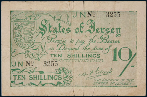 JERSEY, German Occupation, WWII, States of Jersey, ten shillings, undated (1941-42) (P.5a). Several tears and a few pin holes otherwise fine.