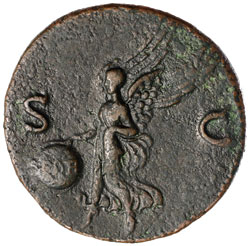 NERO, (A.D. 54-68), AE As, Lugdunum mint, issued A.D. 67, (10.492 grams), obv. bare head of Nero to right, around IMP NERO CAESAR AVG P MAX TR PPP, rev. S C across, Victory flying left holding in both hands shield inscribed SPQR, (cf.S.1976, RIC 695, BMC 381). Full legend attractive brown patina, very fine and scarce.