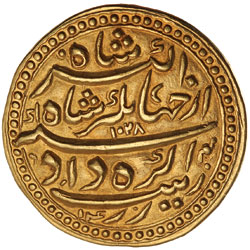 The somewhat careless engraving suggests a court presentation piece subsequent to Jahangir's reign. CNG Triton Sale January 10, 2006 (lot 1696) sold a similar piece from the same dies. CNG noted the following in their sale. The Emperor Jahangir struck a remarkable series of figural type rupees and mohurs, unprecedented for a Muslim prince. Besides extremely rare portrait pieces, he instituted a series of Zodiacal types, each one to be struck in the corresponding month. The obverse dies were reused from year to year, new dated reverses being produced for each subsequent issue. In addition, special specimen strikes were apparently produced for important visitors to the Mughal court, each receiving a coin with his Zodiac symbol. These Zodiac presentation coins continued to be struck for the Mughal emperors until the final dissolution of the empire in the 19th century. It is important to distinguish the early restrikes, which were official issues of the Mughal court, from the later imitations, which are private strikes made for purposes of bullion accumulation, or for the deception of collectors. Many of the official court types, both Jahangir's originals and the restrikes of his successors, are extremely rare, with no known complete set of the mohurs in private hands.